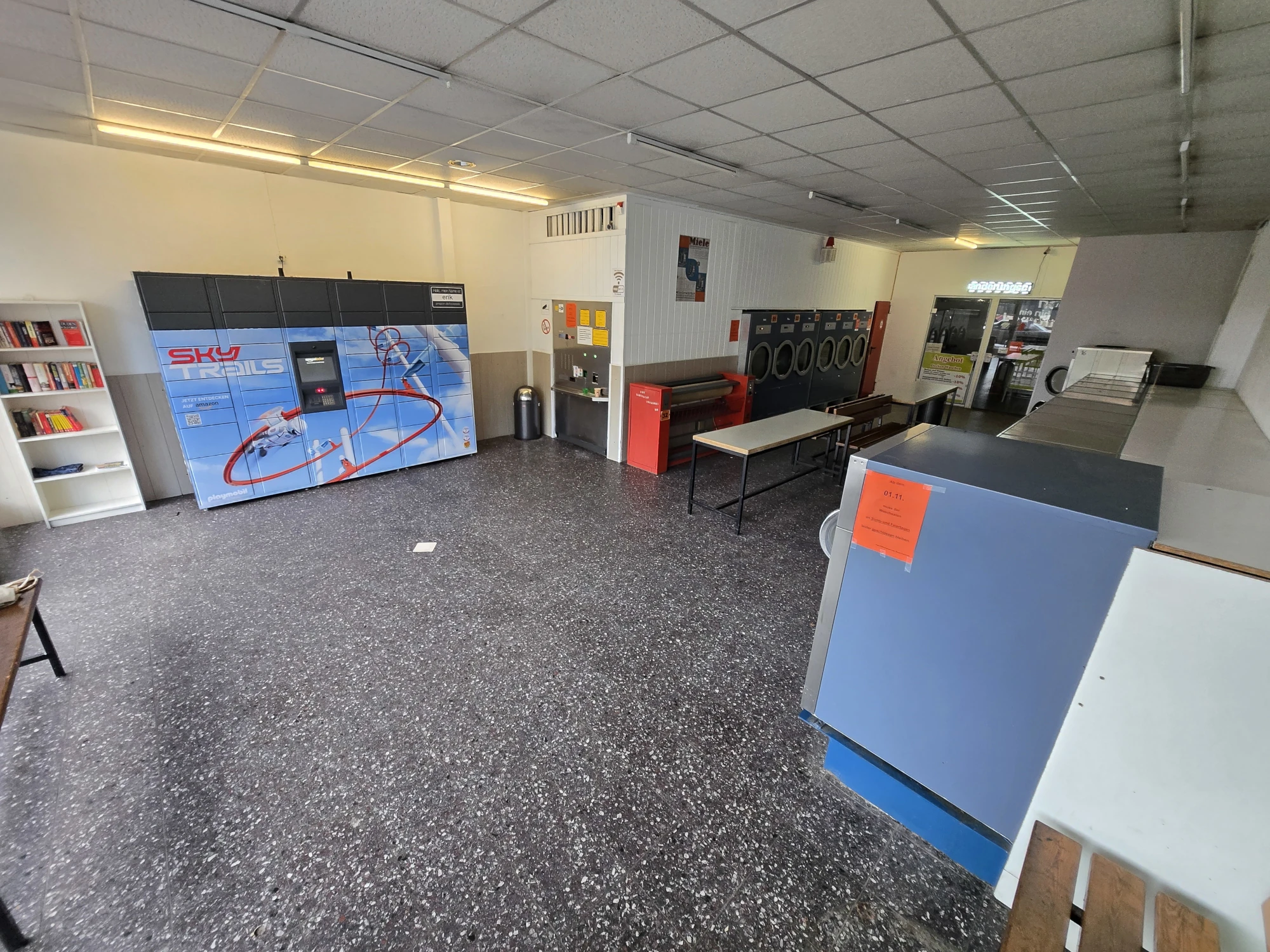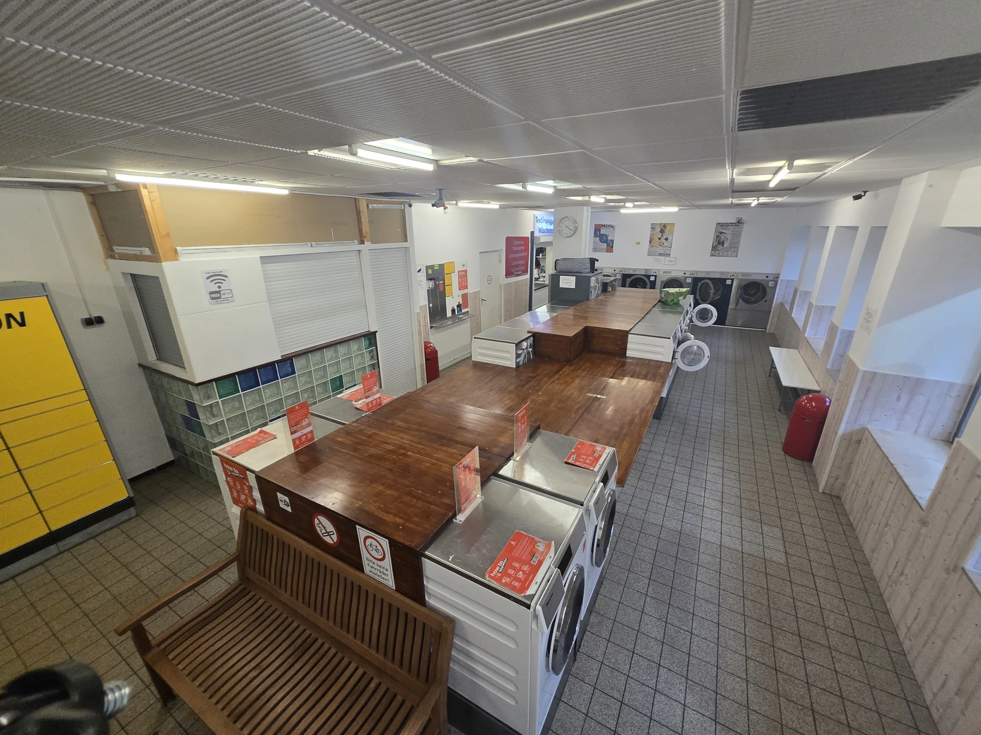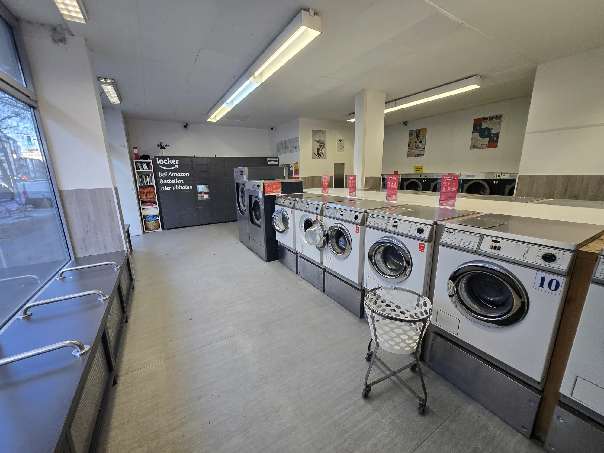 Und damit es dir nicht langweilig wird, gibt es eine Leseecke mit offenem Bücherschrank, Snack-Automaten und genug Sitzplätze. Unsere Mitarbeiter sind natürlich auch gerne für ein Pläuschchen da, wenn sie nicht gerade anderen Kunden helfen. Oder sie übernehmen das Bügeln für dich. Teamwork makes the dream work!